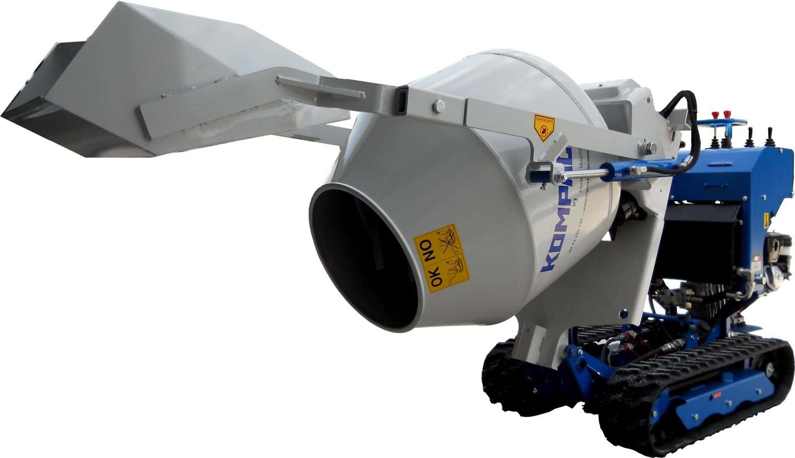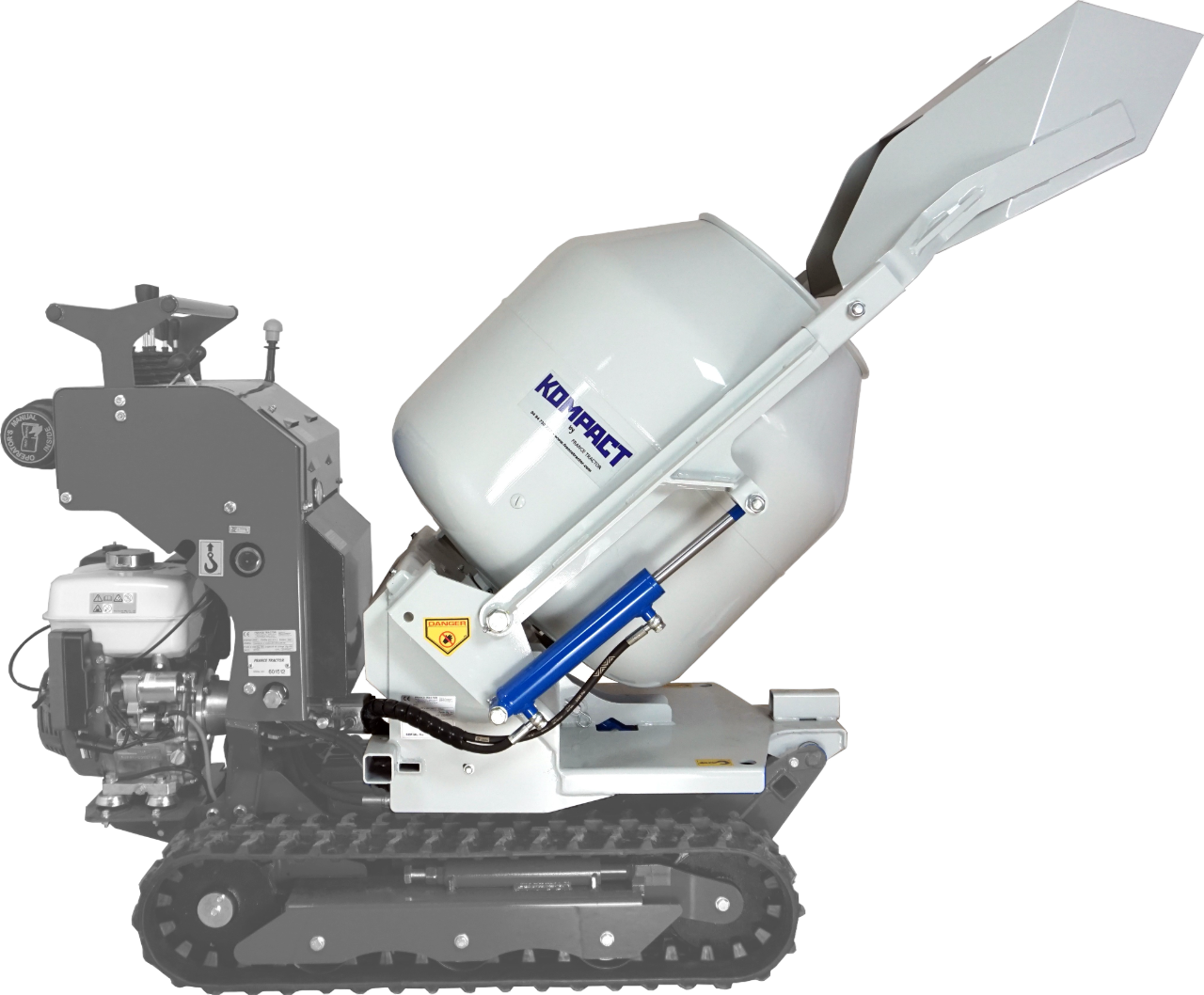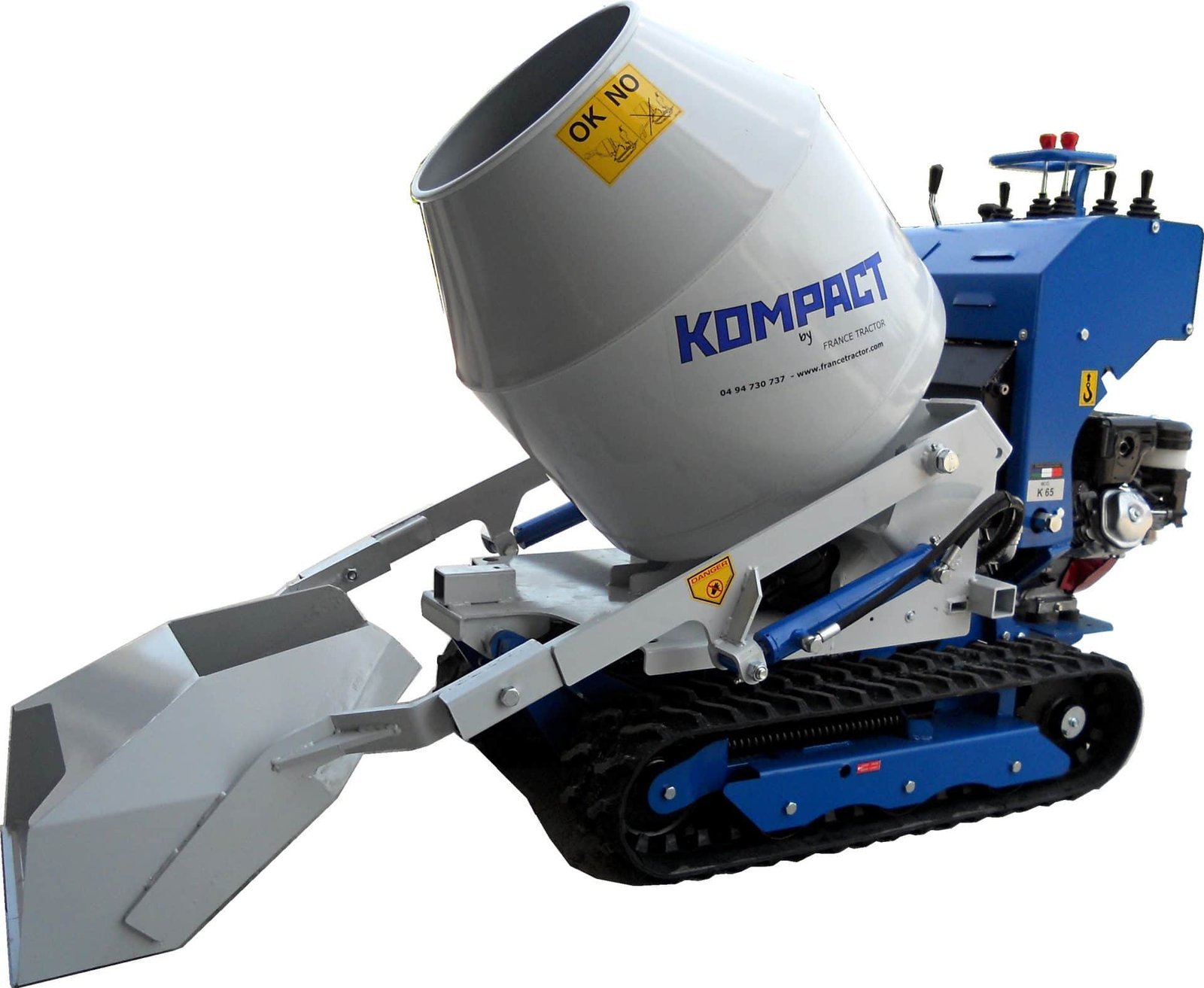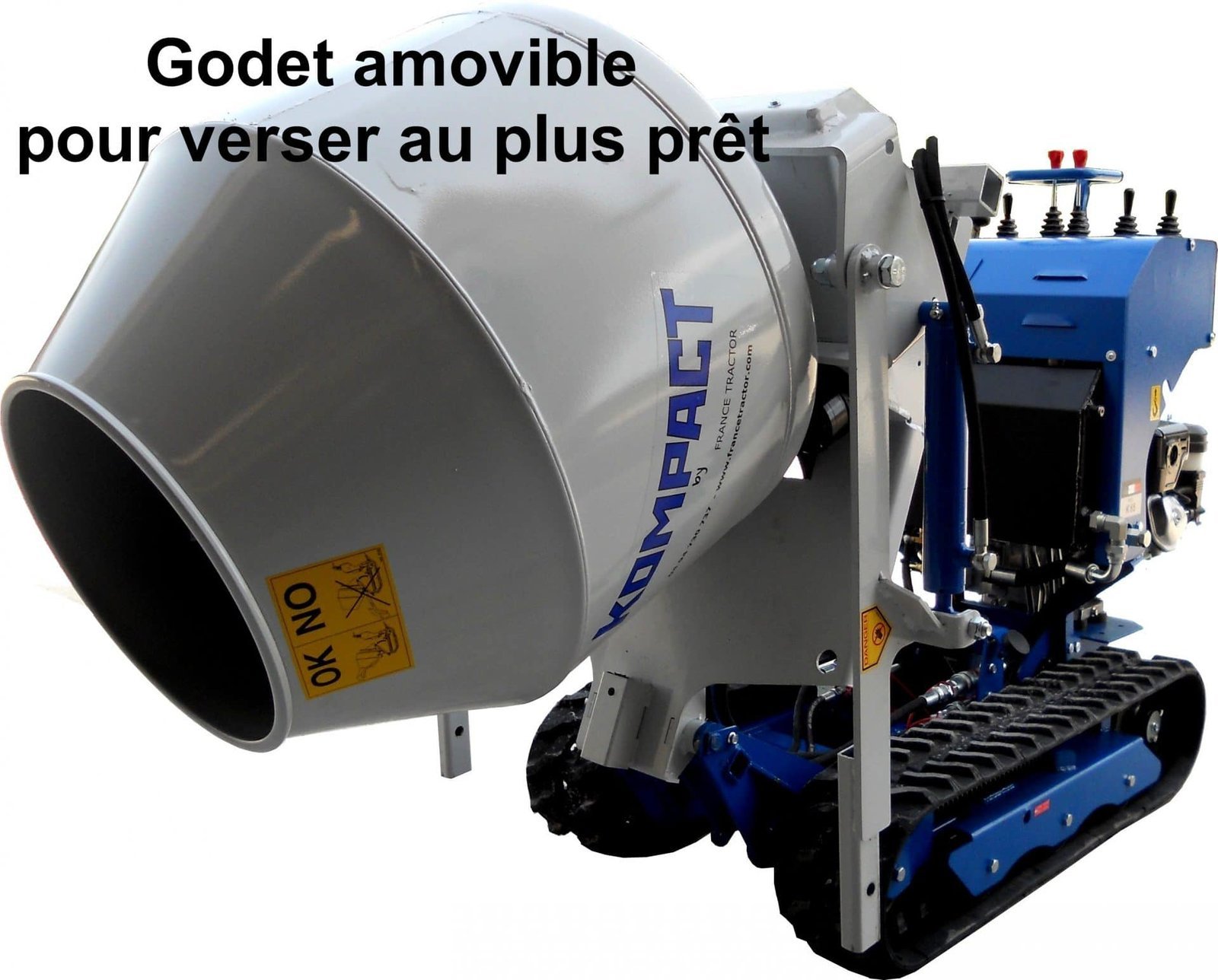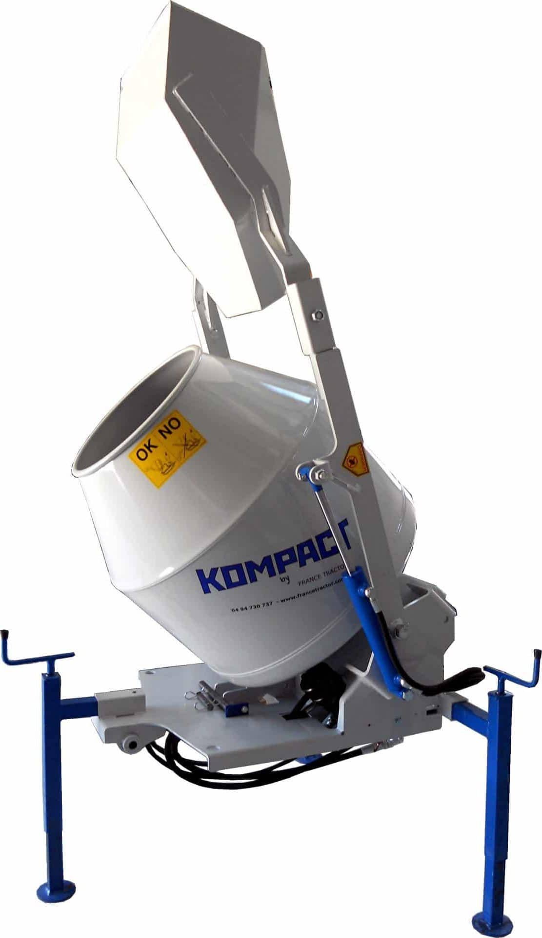 Bétonnière auto-chargeuse 250L pour chenillard K65 – Malaxage continu et déversement précis Marque : KOMPACT Capacité et volume : Volume brut : 250 L Volume utile :210 L (mélange pour 3 sacs de ciment de 35 kg) Volume godet : ˜12 pelles de maçon chargées Performances et rendement : Productivité : jusqu’à 12 m³ coulés et étalés par jour Rotation : 27 tours/min (malaxage en continu pendant le trajet) Force de levage : 150 kg Fonctionnalités : Auto-chargeur : chargement rapide et automatique via godet Fonctions simultanées au guidage du chenillard : rotation et vidage Hauteur de déversement : ajustable de 50 cm à 20 cm du sol Godet amovible : permet un coulage au plus près d’un mur Compatibilité et installation : Adaptable sur chenillard K65 Fixation rapide : 3 pieds à manivelle fournis pour la pose/dépose Alimentation : s’alimente sur le système hydraulique du chenillard en raccord push-pull Inclus et remarque ⇒Inclus : bétonnière auto-chargeuse, pieds à manivelle × Non inclus : le transporteur à chenilles multi-outils K65 Cet accessoire fait parti de la gamme des accessoire du transporteur à chenilles hydrostatique K65 que vous pouvez retrouver ici.