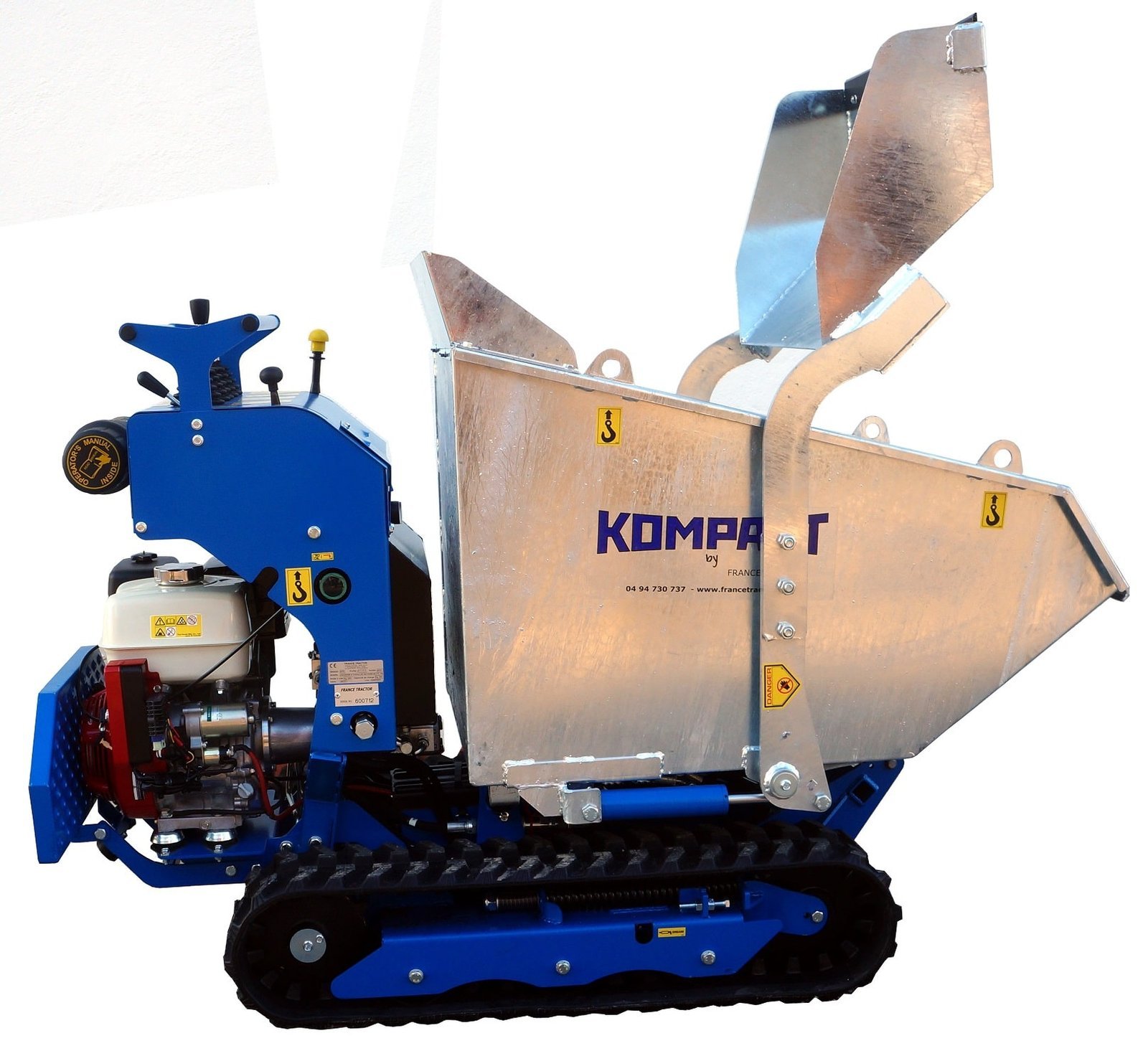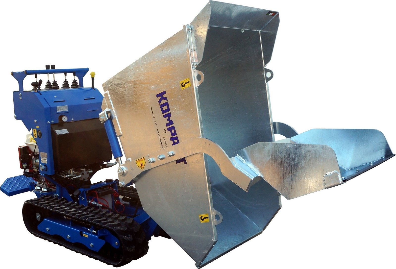 Cuve auto-chargeuse en acier galvanisé 350 L avec godet hydraulique pour chenillard K65 – 2 vérins, basculement hydraulique, 140kg, épaisseur 4mm Marque : Kompact Fonctionnalités et compatibilités : Basculement hydraulique pour un vidage sans effort Résistance accrue aux impacts, ne rouille pas, grâce à l’acier galvanisé à chaud Manipulation facilitée des matériaux lourds grâce à sa pelle hydraulique Accessoire compatible avec les transporteurs à chenilles K60, K65 Vigne et K65 – alliés des chantiers, des champs et des vignobles. Utilisation en travaux publics, construction, rénovation, voirie et aménagement paysager Capacités et caractéristiques : Capacité : 350 litres Poids porté maximale : 750 kg Contenance du godet : 60 litres Force de levage : 200 kg Matériau : acier galvanisé 4 mm 2 vérins hydraulique dédiés au godet pour le chargement 1 vérin hydraulique dédié au basculement de la cuve Dimensions : Dimensions intérieures cuve : 110 x 60 x H 65 cm Largeur aux vérins : 74 cm Hauteur cuve : 85 cm Poids : 140 kg Inclus et remarque : ⇒ inclus : la cuve avec sa pelle auto-chargeuse, les flexibles hydrauliques et les vérins × Non-inclus : le transporteur à chenilles Garantie 3 ans