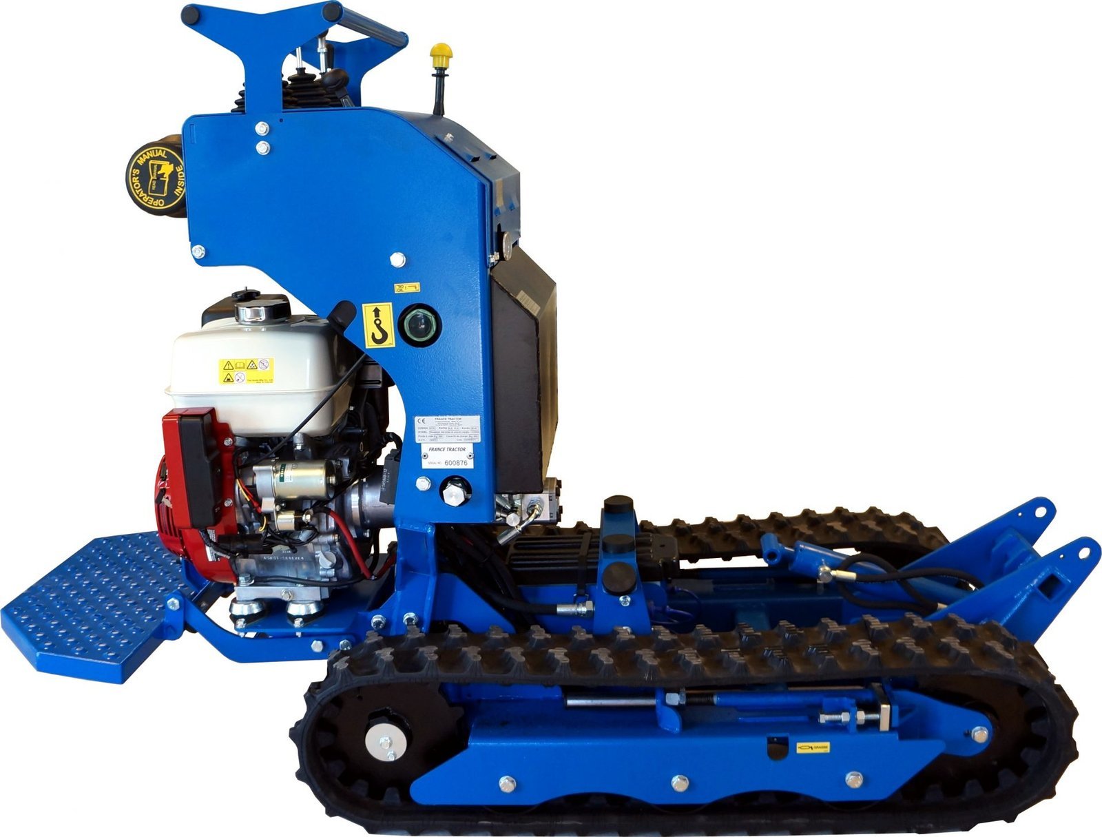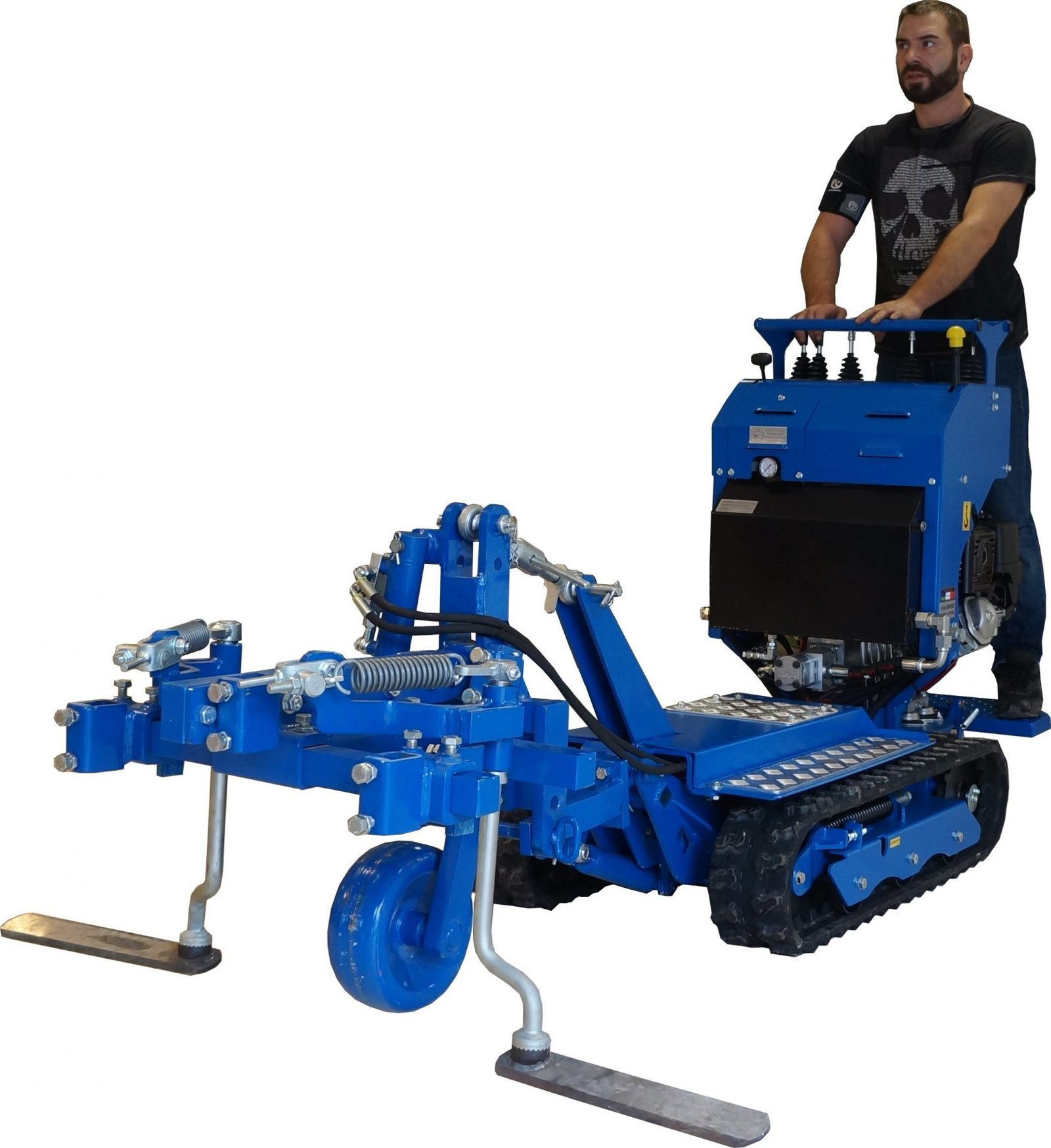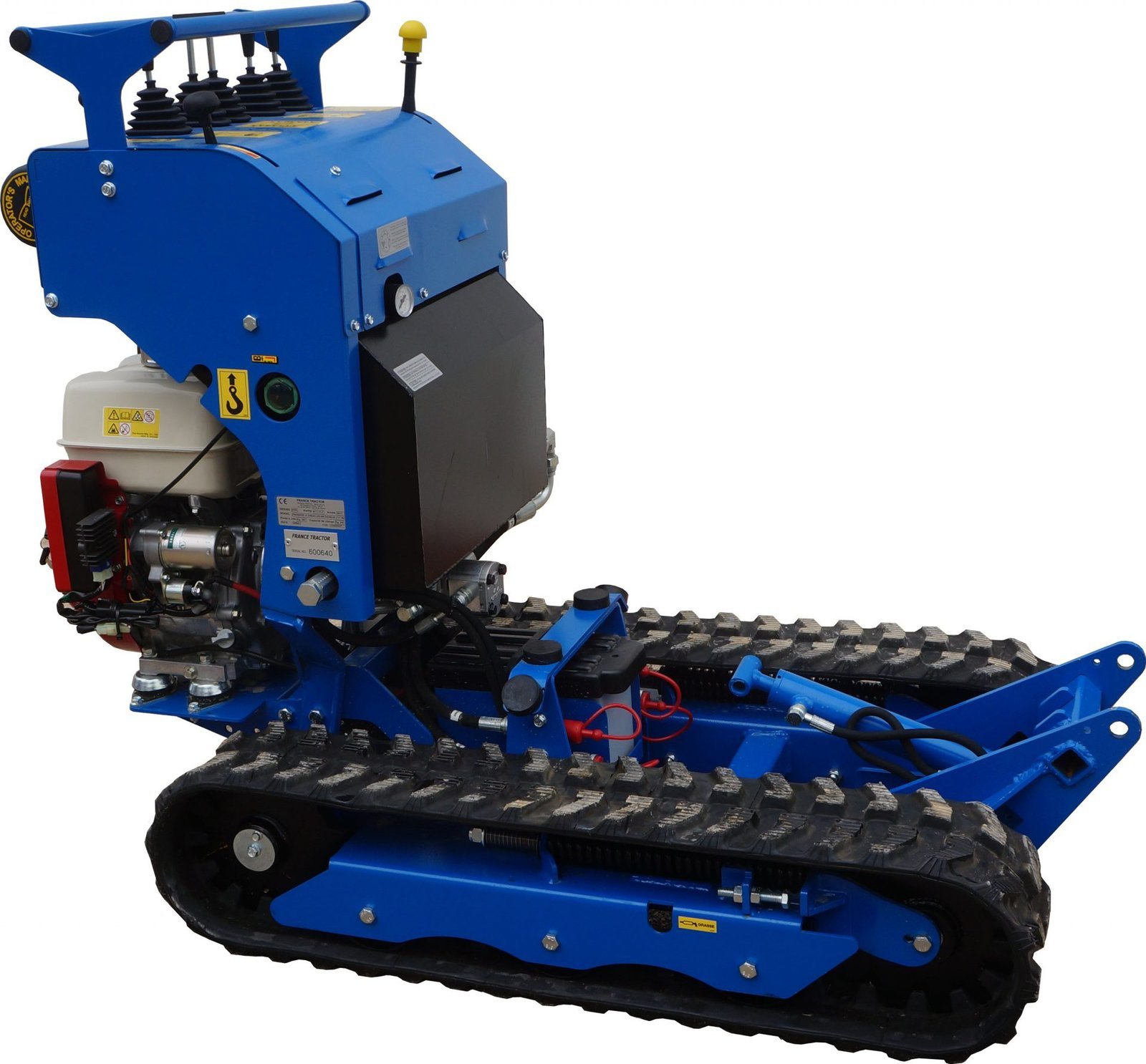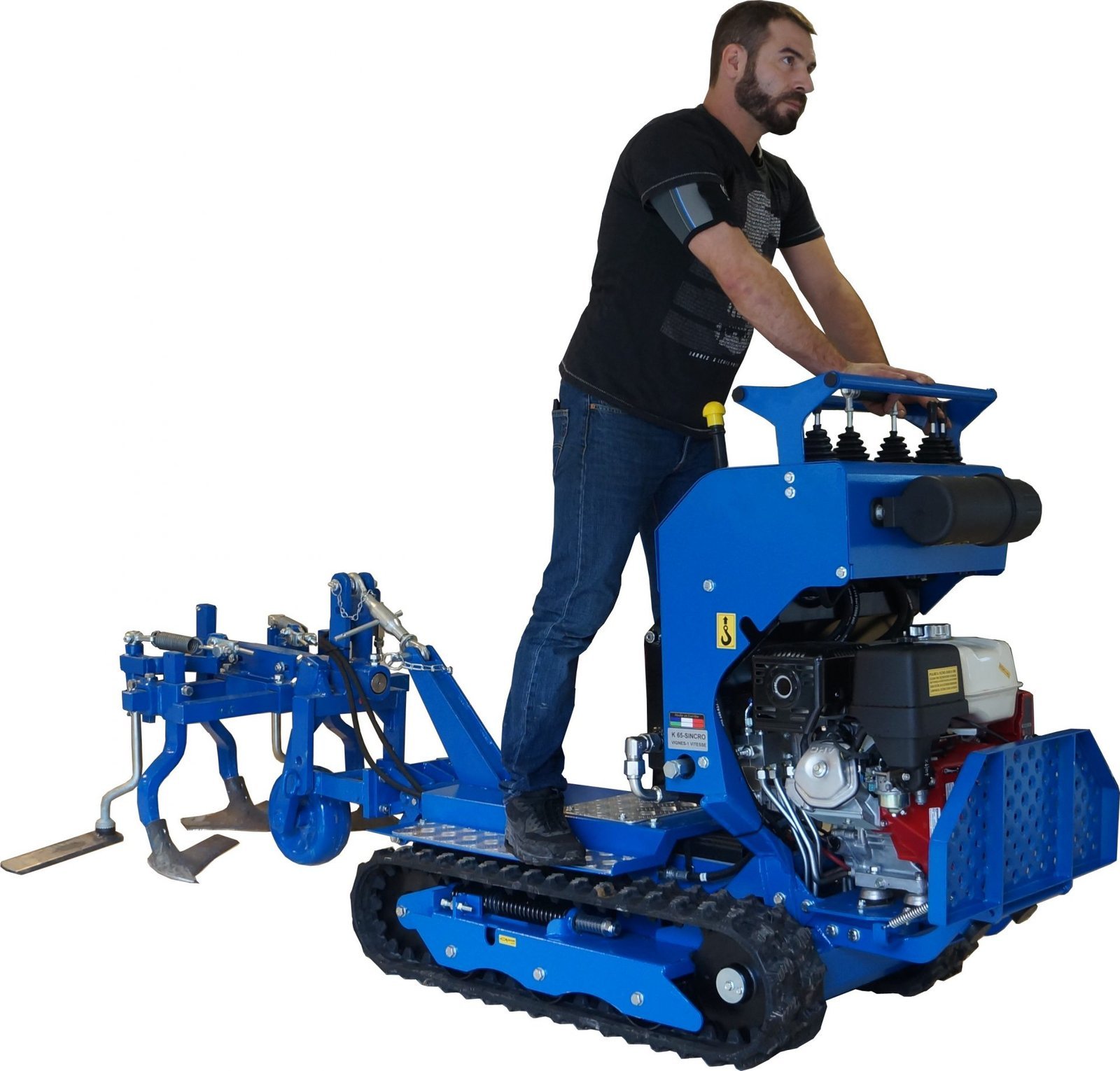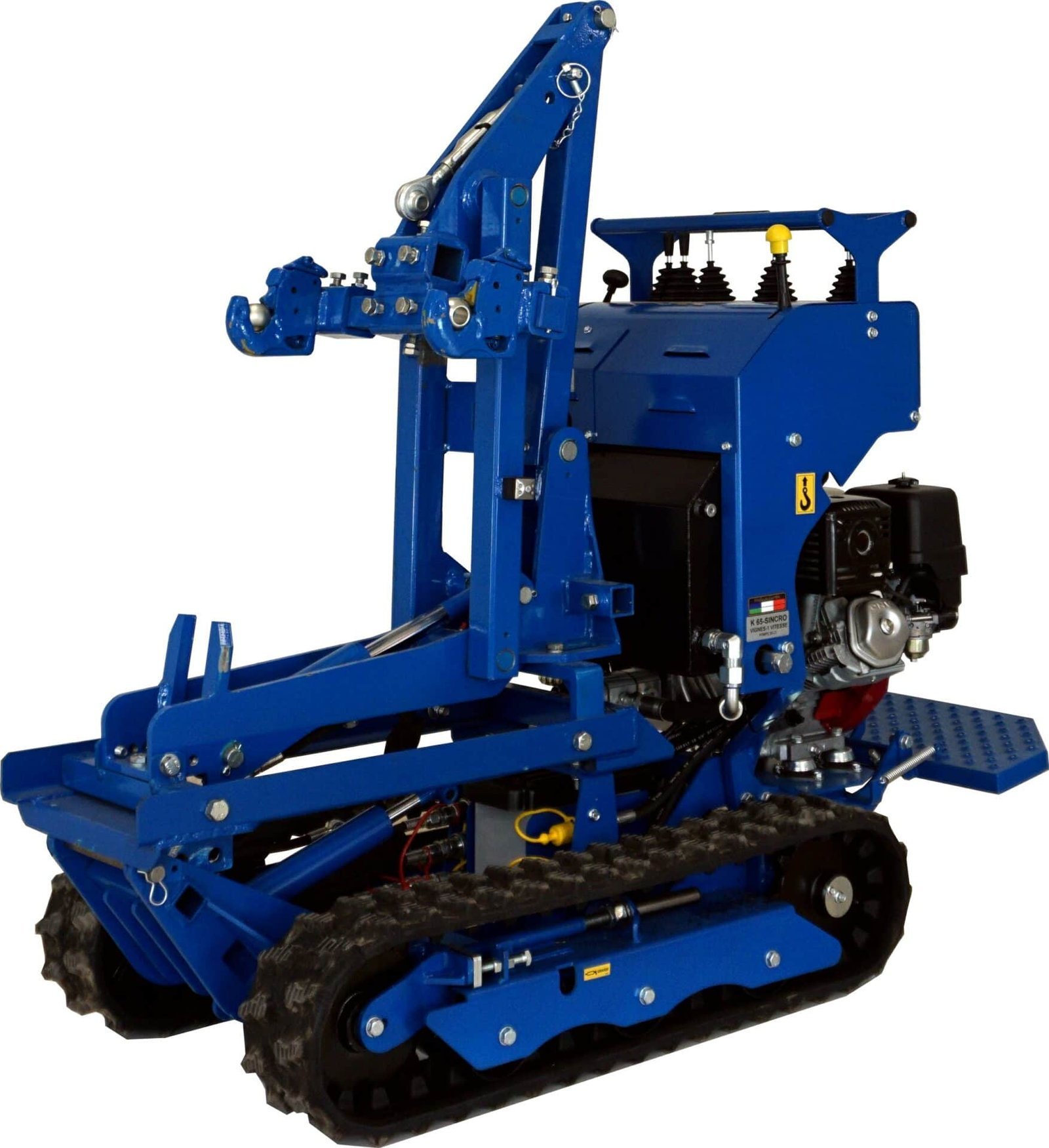 Après 8 ans et plus de 1 000 chenillards K65 standard vendus, une nouvelle version : « Spéciale vignes » vient compléter notre gamme viticulture Polyvalent, il peut tirer une charrue, pousser des interceps, recevoir un broyeur à sarments, un atomiseur, une rogneuse, un plateau de débardage mais aussi une mini pelle ou une benne auto chargeuse. Pour les tournières étroites en bout de rang, les charrues peuvent être montées sur un parallélogramme. Doté d’une mono-poignée de direction, le guidage s’effectue d’une seule main, sans fatigue et avec une grande précision. Une barre de maintien large permet au pilote de s’arrimer fermement quelque soient les difficultés du terrain. Notre K65 « Vignes » est équipé en série de clapets antiretour sur ses moteurs d’entrainements hydrauliques, cela lui confère une excellente sécurité en charge sur fortes pentes. Pour compenser tout risque sur dévers, nous avons travaillé sur l’abaissement optimal du centre de gravité afin d’obtenir un très haut niveau de sécurité. GARANTIE TOTALE : 3 ANS ( Lire l’onglet : Garantie en bas de page )