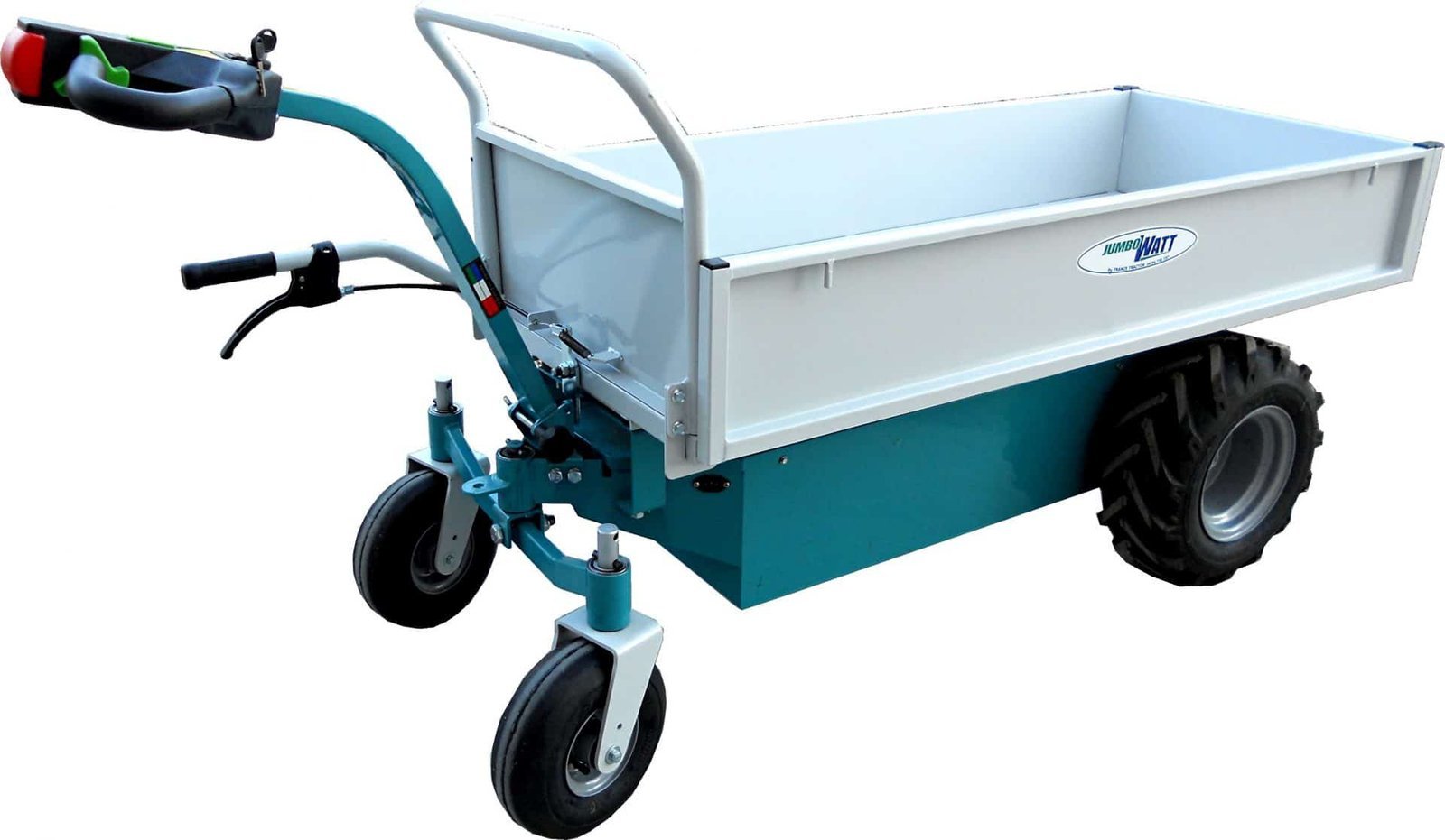 Ce plateau à ridelle de 140 cm est un plateau en acier laqué qui s’adapte sur le transporteur à chenilles Jumbo Tracteur L4, disponible ici . Ses ridelles peuvent s’écarter pour transporter des objet volumineux ou amovibles pour devenir un plateau simple. Le plateau est présenté monté sur le chariot électrique L4 à timon et L4 à guidon.